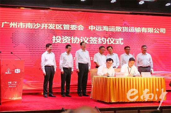 丁紅都(前左)代表南沙與中遠海運散貨運輸有限公司簽署投資協議。(資料圖)劉偉 攝