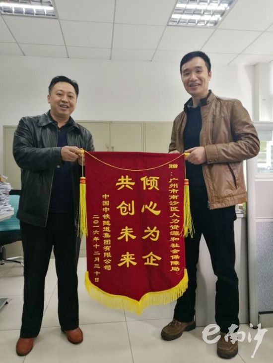 中鐵遂道集團有限公司人事專員親手把錦旗交到南沙區人社局工作人員手上。(資料圖)