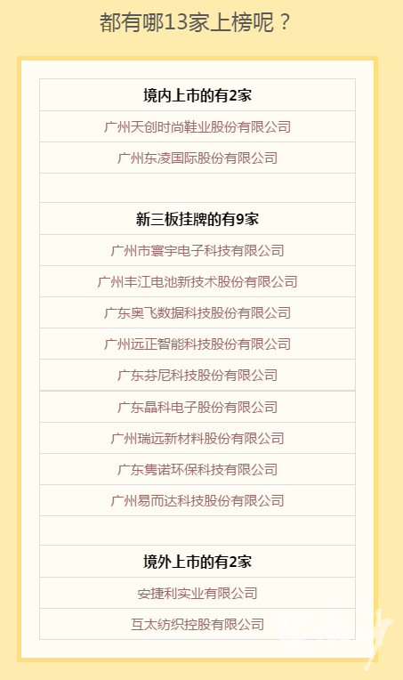 據(jù)了解,廣州易而達(dá)科技股份有限公司成功上市后,南沙目前上市掛牌企業(yè)已經(jīng)增加至13家。其中,有兩家企業(yè)在國內(nèi)主板上市,兩家企業(yè)在香港上市以及9家中小企業(yè)在新三板掛牌。(記者舒霞)