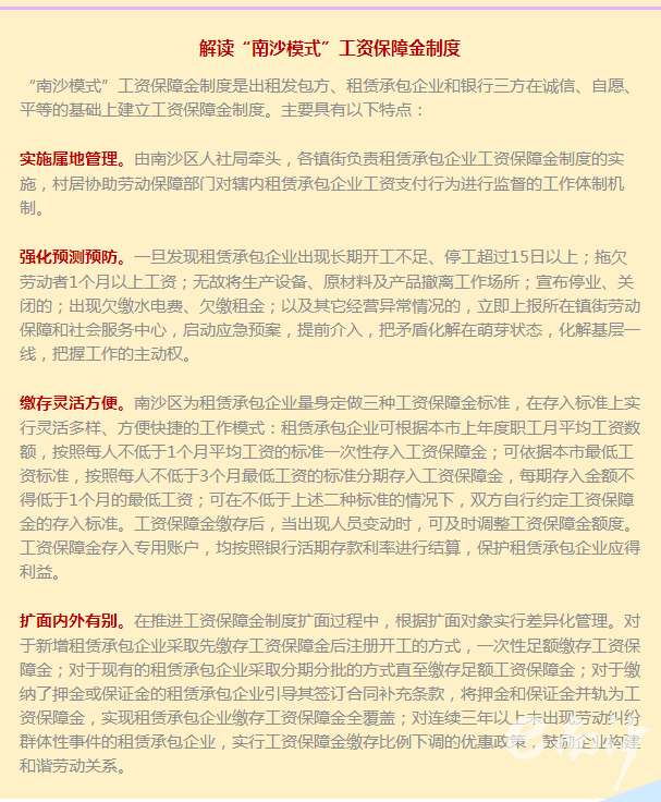 據介紹,作為國家新區、自貿試驗區、全面深化改革前沿陣地的南沙,從2016年4月起結合區內用工形勢,在租賃承包領域建立了工資保障金制度。一年時間內,已有租賃承包企業121家繳納工資保障金共計4358萬元,惠及勞動者22792人。