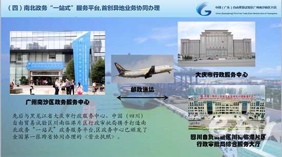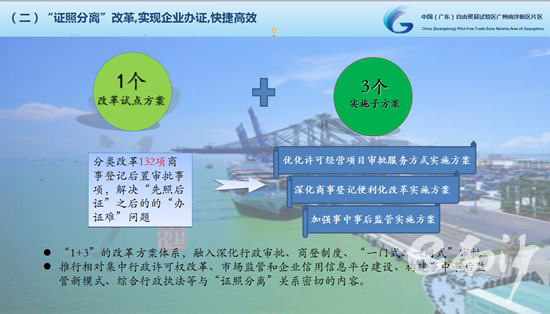 “證照分離”實現企業(yè)辦證更加便捷高效。南沙區(qū)選取企業(yè)反映訴求突出、審批頻次較高、改革預期效果較明顯、符合南沙自貿片區(qū)重點產業(yè)發(fā)展需求的132項商事登記后置審批事項進行分類改革,加強風險評估和進行動態(tài)調整,解決“先照后證”之后的“辦證難”問題。圍繞行政審批事項分類改革、創(chuàng)新行政審批服務運行模式、強化事中事后監(jiān)管三大改革任務,全區(qū)提出了14項具體改革措施,細化制定了“證照分離”改革試點方案和優(yōu)化許可經營項目審批服務方式、深化商事登記便利化改革、加強事中事后監(jiān)管3個配套方案,形成了“1+3”的改革方案體系。 截止今年7月,共受理業(yè)務872宗,累計為企業(yè)節(jié)省辦理時間8440天,減少申請材料2981份。跨省政務合作首創(chuàng)異地業(yè)務協同辦理。為積極響應國務院關于東北地區(qū)與東部地區(qū)部分省市對口合作工作方案,方便企業(yè)跨區(qū)域投資辦事,南沙區(qū)先后與黑龍江省大慶市行政服務中心、中國(四川)自由貿易試驗區(qū)川南臨港片區(qū)行政審批局、貴州貴定縣政務中心、江西龍南縣政務中心等市、區(qū)(縣)攜手打造政務“一站式”服務平臺,在企業(yè)投資業(yè)務異地辦理領域開展合作,后續(xù)還將陸續(xù)推出企業(yè)投資、準入、準營等多個方面辦證服務。