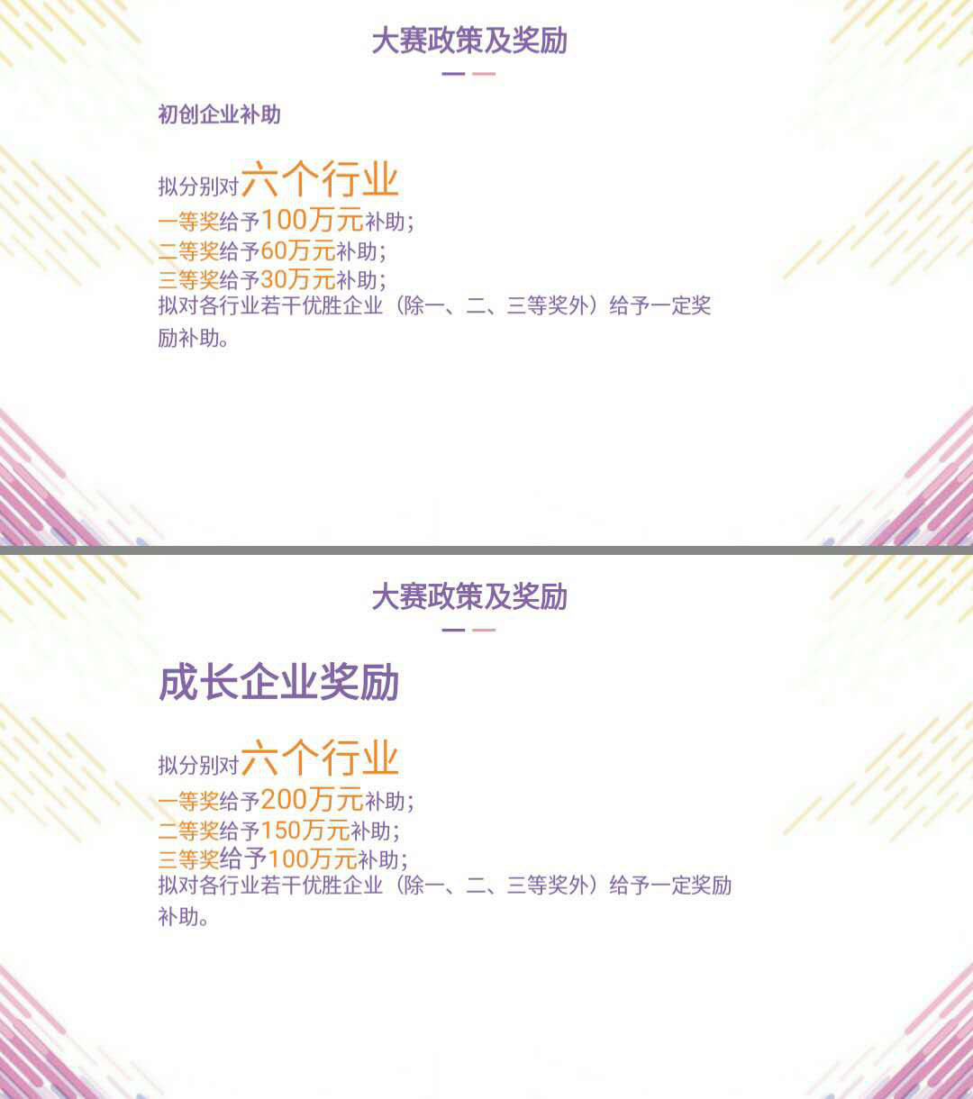 大賽共設(shè)置新材料、生物醫(yī)藥、電子信息、新能源與節(jié)能環(huán)保、先進(jìn)制造、互聯(lián)網(wǎng)與移動(dòng)互聯(lián)網(wǎng)6個(gè)行業(yè)分賽,每個(gè)行業(yè)分賽根據(jù)企業(yè)的注冊(cè)時(shí)間分為“初創(chuàng)企業(yè)組”和“成長(zhǎng)企業(yè)組”兩個(gè)組別進(jìn)行比賽。市賽“初創(chuàng)企業(yè)組”第一名將獲得100萬(wàn)元政府補(bǔ)助;市賽“成長(zhǎng)企業(yè)組”第一名將獲得200萬(wàn)元政府補(bǔ)助。