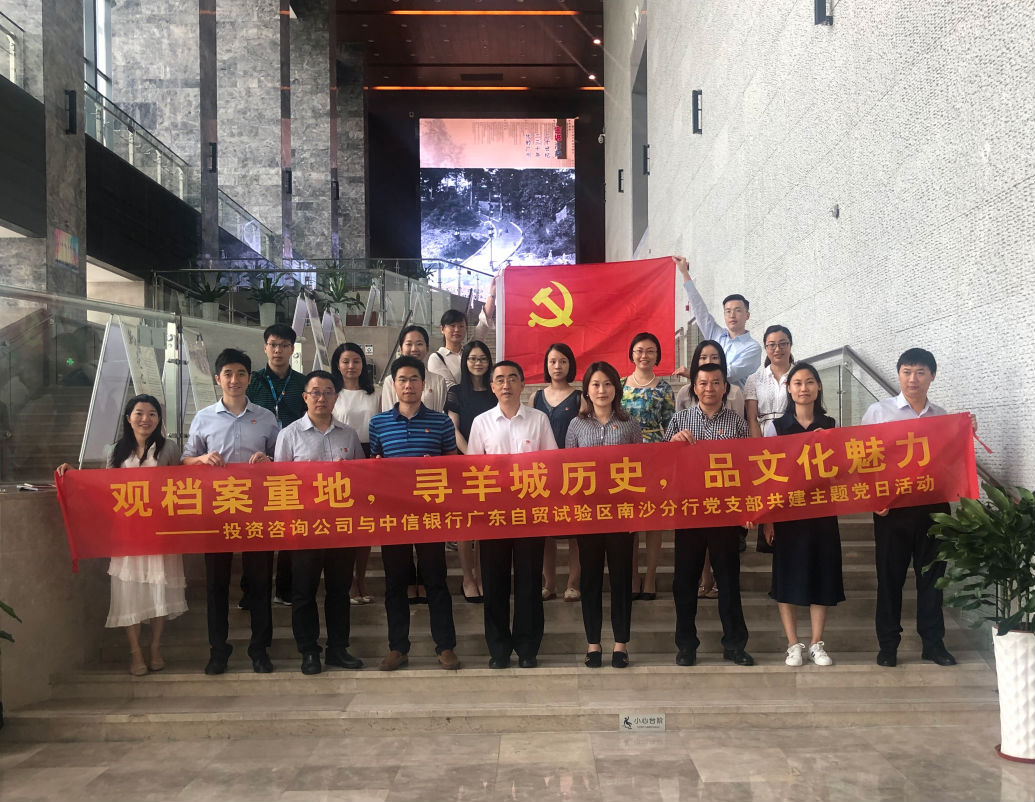 為做好“不忘初心、牢記使命”主題教育工作,全面落實習近平總書記“鑒古知今,學史明智”的重要講話精神,發揮黨支部戰斗堡壘作用,公司黨委下屬投資咨詢公司黨支部于8月13日與中信銀行廣東自貿試驗區南沙分行黨支部攜手赴廣州市國家檔案館開展“觀檔案重地,尋羊城歷史,品文化魅力”主題黨日共建活動。